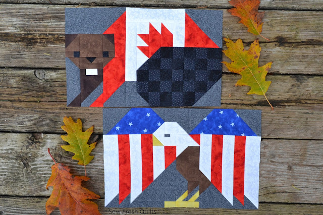 The Forest Friends quilt pattern consists of the following sized quilt blocks. The American Eagle, Canadian Beaver and the Love Birds blocks all finish at 8” x 13”. The Deer, Bear, Squirrel and both Fox blocks each finish at 8” x 8”. The Deer Hoof Prints, Bear Paws Prints and Canoe Paddle blocks all finish at 4” wide. This allows for a variety of settings in which your blocks can be used to make cushions, place mats, table runners, wall hangings or quilts from baby to big. Adding wider sashing and borders will also help you to adjust this pattern up to the size you desire.