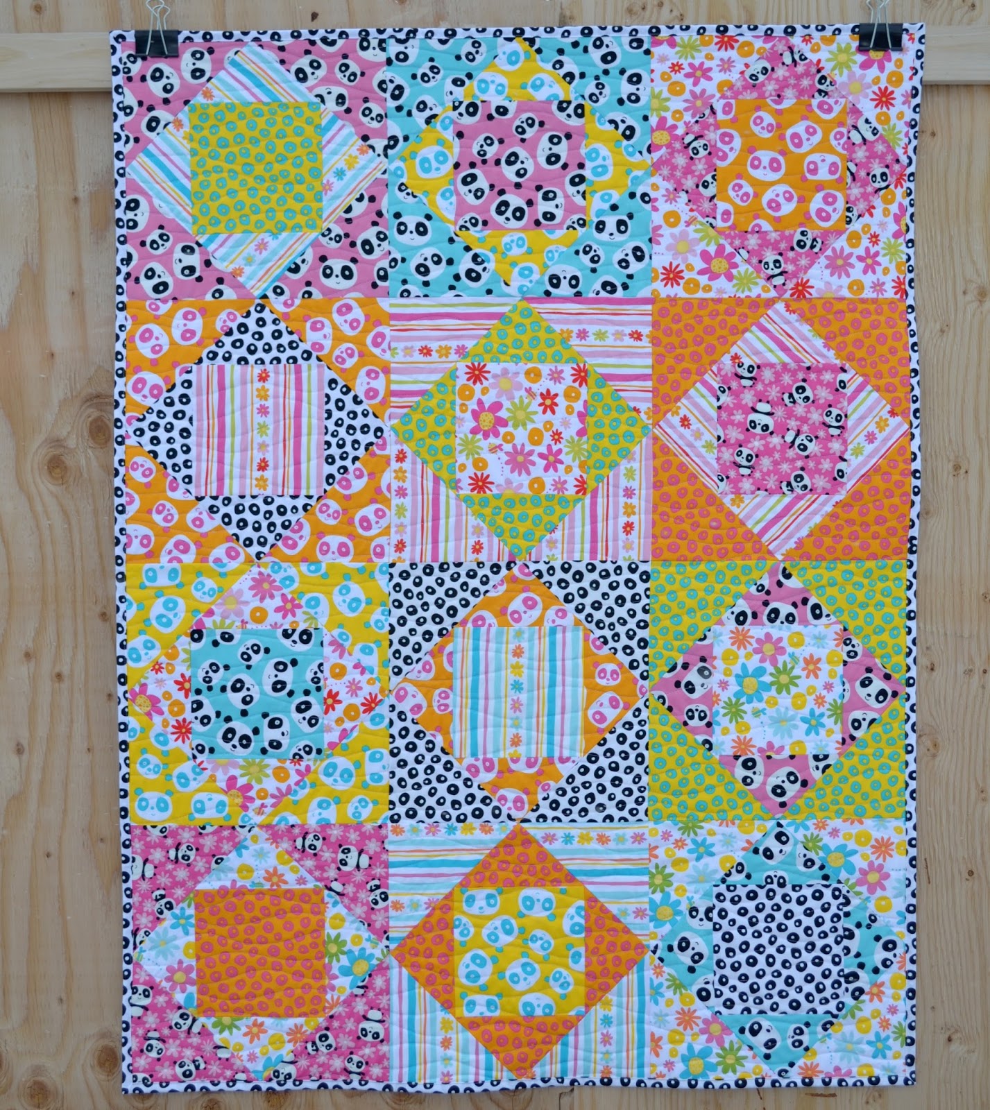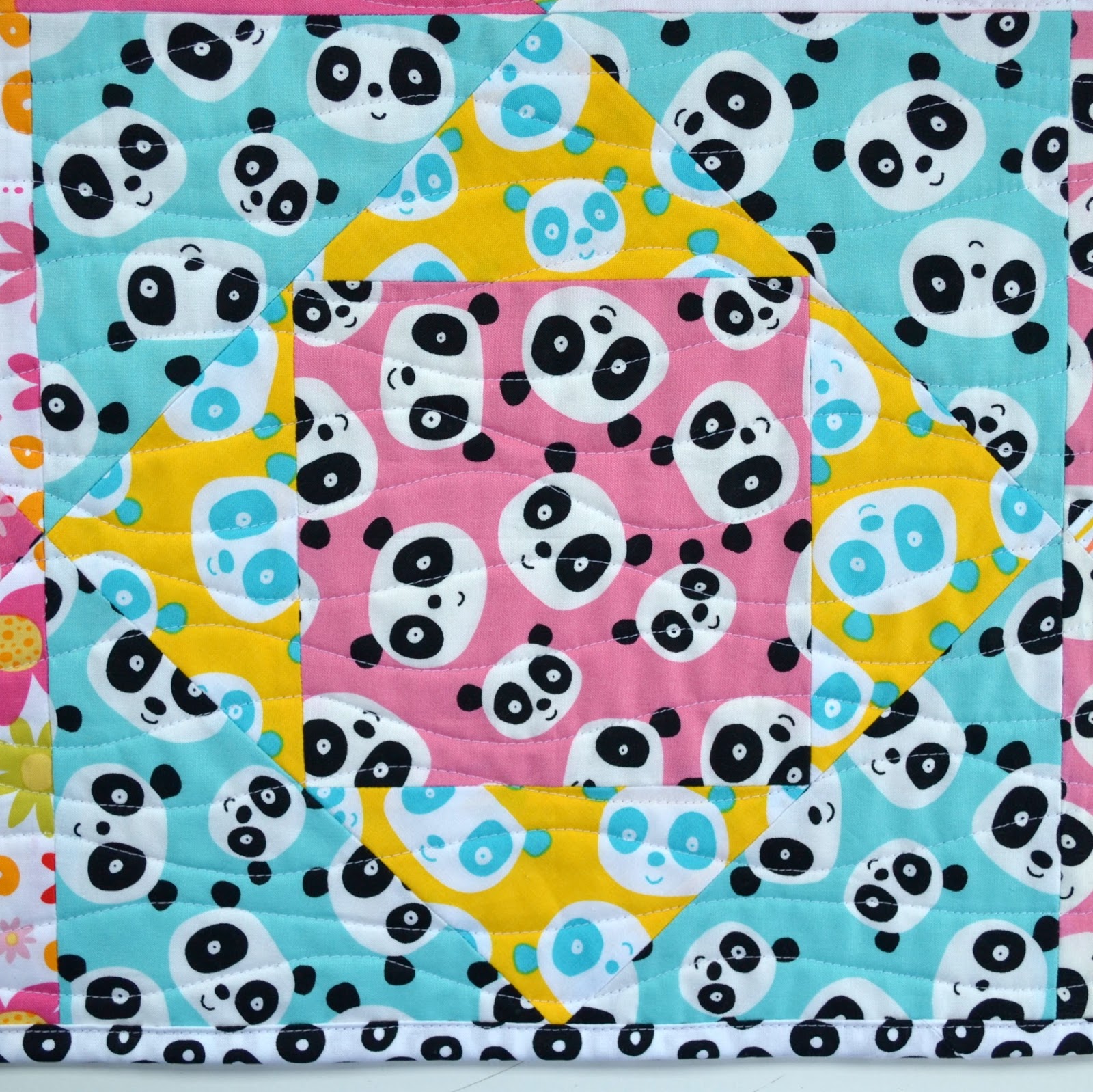 I've always found the Economy Block, also known as the Diamond in a Square or Square in a Square quilt block, interesting. So when I was approached by Free Spirit Fabrics, asking if I would like to play with these cute panda prints... I jumped at the chance to make a baby quilt using great big 12" squares!