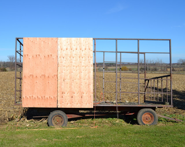 Here you can see the Smitten Kitten quilt hanging out on the hay wagon in front of the bean field and with the beautiful blue sky in the background.