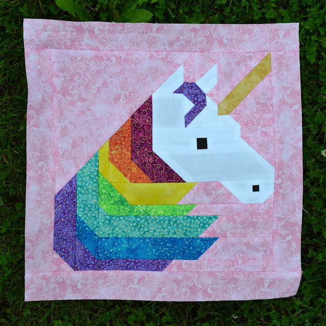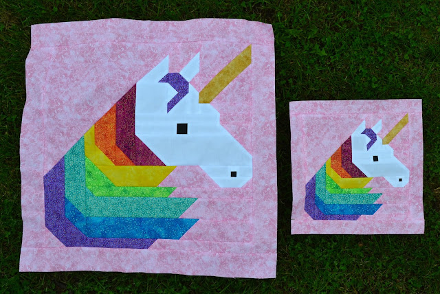 The Rainbow Unicorn pattern provides instructions for three sizes. The blocks are 10" 20" and 40" square and finish at 12", 24" and 48" square including the borders.