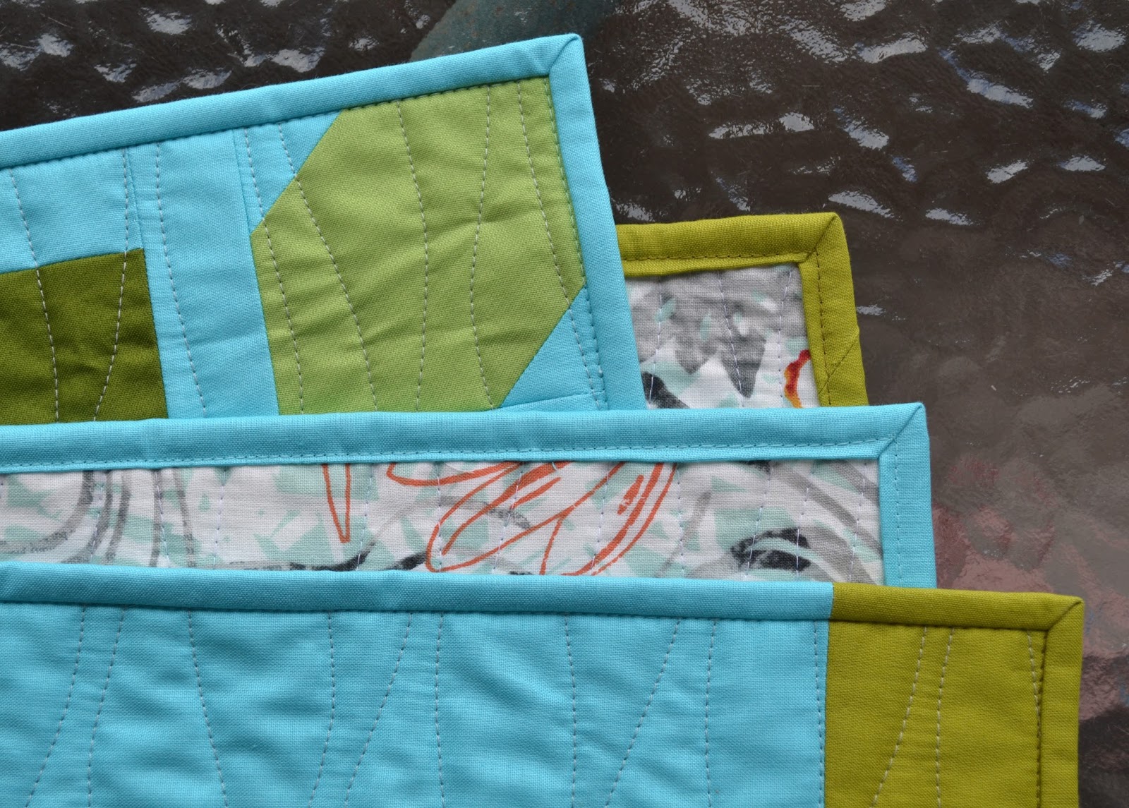 Normally, I attach a binding first to the back of a quilt and then topstitch from the front to finish. But wanting to use a matched binding, this time I attached to the binding to the front. To finish, I topstitched along the "ditch" to catch the binding that had been folded around to the back. I used threads to match the binding both on top and in the bobbin.