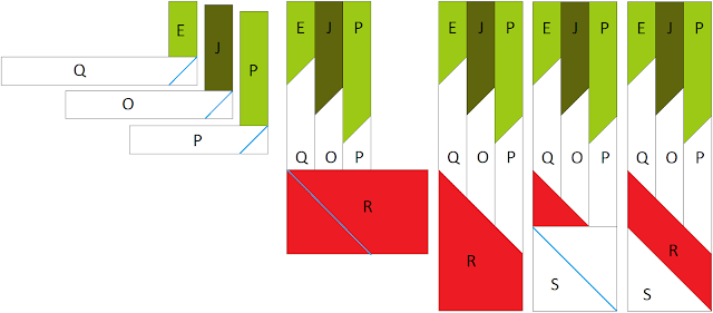 Step 5: Use the STOP method to add the White (Q) on the end of the Light Green (E). Use the STOP method to add the White (O) on the end of the Dark Green (J). Use the STOP method to add the White (P) on the end of the Light Green (P). Sew the units together. Use the STOP method to add the Light Red (R) on the end. Use the STOP method to add the White (S).