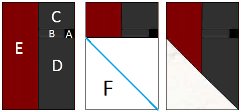 Step 1: To make the EYE, sew the Black (A) to the Dark Grey (B). Sew the EYE between a Dark Grey (C) and (D). Sew a Dark Red (E) to the side. Use the STOP method to add the White (F) square.