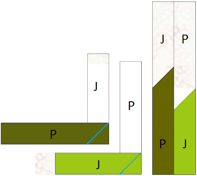 Step 4: Use the STOP method to add the Dark Green (P) on the end of the White (J) and the Light Green (J) on the end of the White (P). Sew the units together.