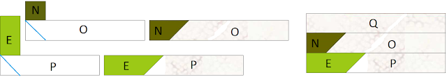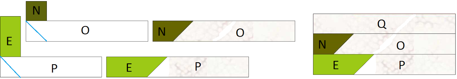 Step 3: Use the STOP method to add the White (O) on the end of the Dark Green (N) and the White (P) on the end of the Light Green (E). Sew the units together and sew a White (Q) on top.