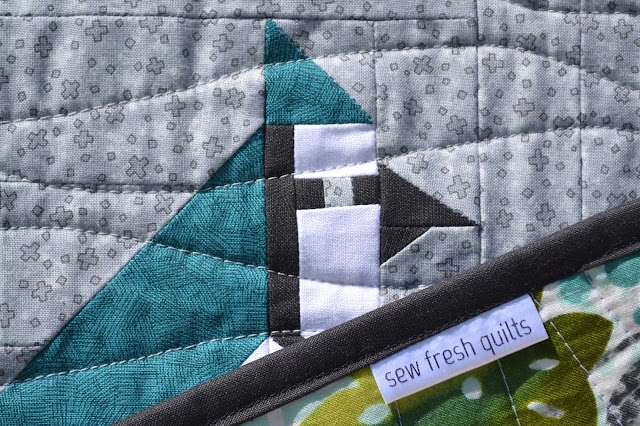 This little quilted table runner was made for my mother for Mother's Day. All the fabric used in the front are from the Hopscotch collection by Jamie Fingal for RJR Fabrics, which you can view here.