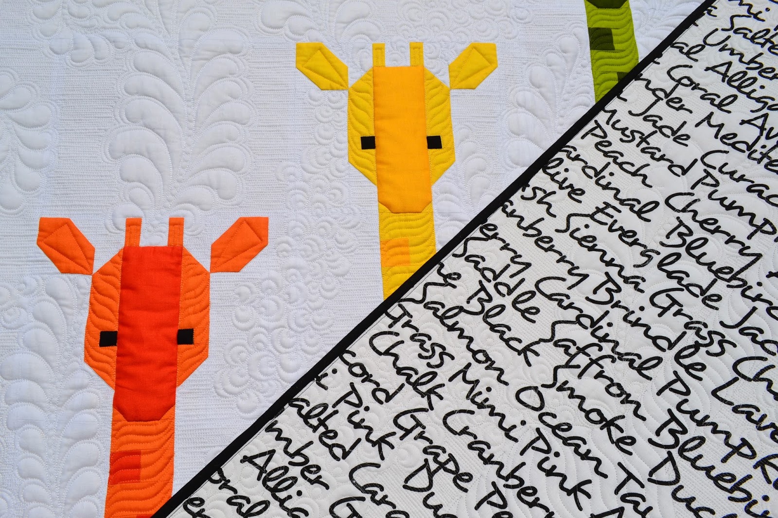 The front is made using a new collection by Tula Pink called Holiday Homies. And the backing is Makin' Waves in Ink from the True Colors collection, also by Tula Pink for Free Spirit Fabrics. The boldness of this print is a great contrast to the front.